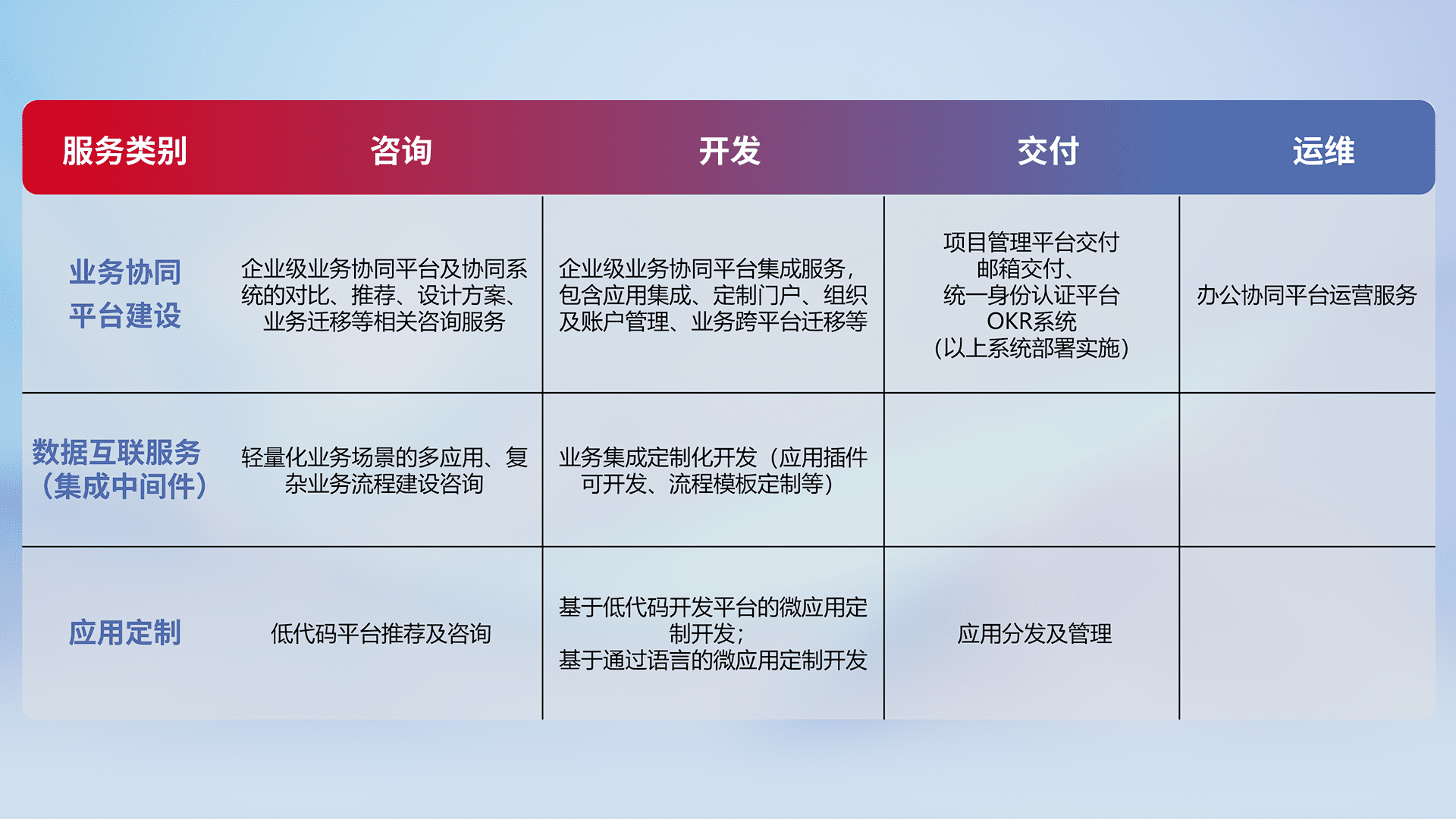 针对钉钉、、、企微、、IDaas等平台级产品提供产品的规划、、、方案、、、交付、、定制化开发等服务,,,,实现如统一协同办公、、、、智能客户服务、、、混合会议管理、、、智能数据查询、、等业务场景,,,实现数字化转型。。