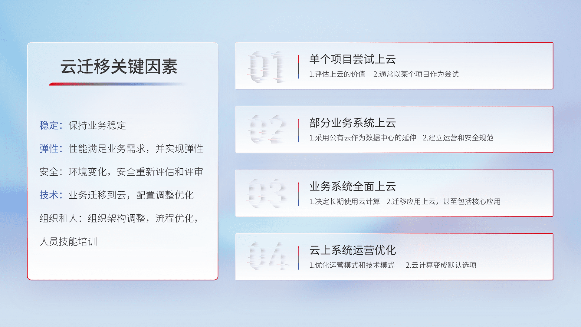 结合实际业务,,,,从规划设计、、、、云平台选型、、云原生改造、、、、数据迁移、、集成交付,,,迁移全过程为客户识别最佳上云路径,,,,做好风险识别管理,,,,设计网络架构、、、、身份权限、、、、安全审计合规、、操作审计、、、、日志审计、、监控告警策略、、、、多站点容灾设计等,,,对云上基础设施进行整体规划,,,,提升IT治理水平,,,,以满足弹性、、高可用、、、高性能的需求。。。。