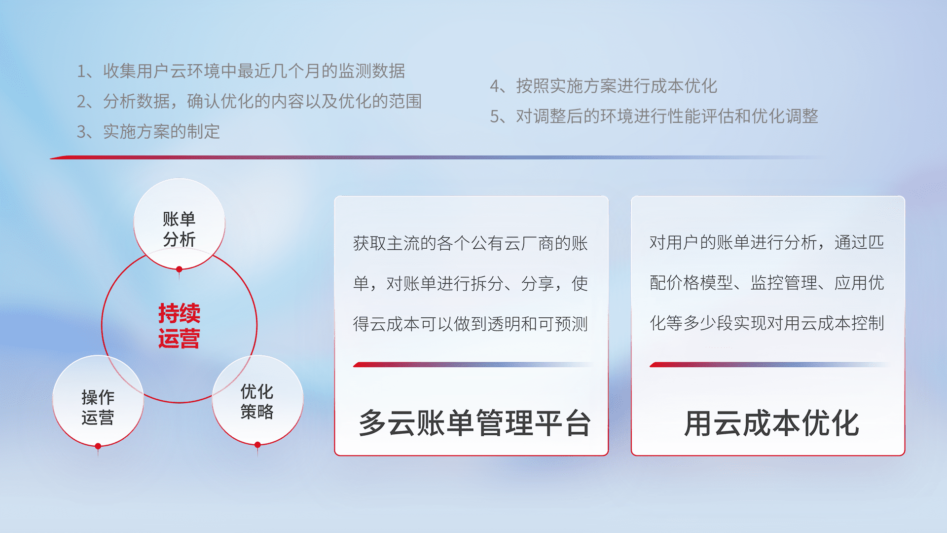 通过多云纳管,,,以统一的资源数据模型把客户的云资源进行抽象和封装,,,,进而实现对多云资源的统一操作,,,,保障云资源管理的可靠性、、、、稳定性与可用性。。。量身定制化运维内容,,,配置、、、开发运维、、补丁管理、、备份、、、监控、、认证和访问管理、、、审计和日常巡检等,,,保障在用云过程中的可靠度,,,,稳定度以及高可用率。。。。
